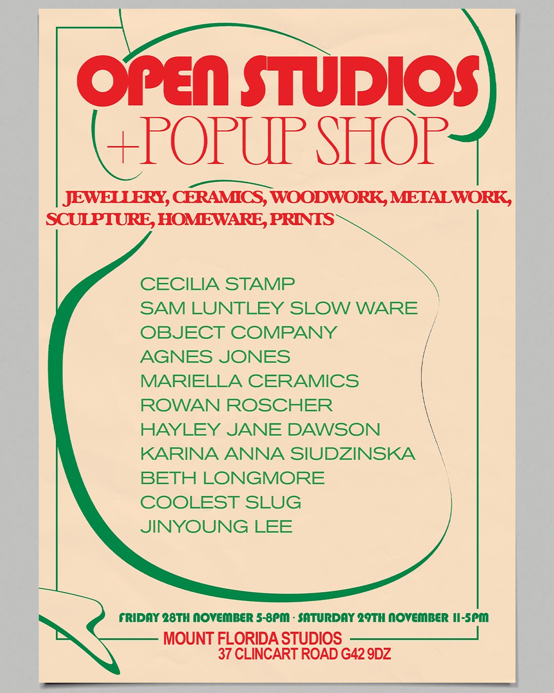 If you’re in Glasgow, we’d love to welcome you for another open studios event in Mount Florida. It’s the perfect opportunity to step inside our workspaces and browse a selection of finished pieces alongside works in progress.